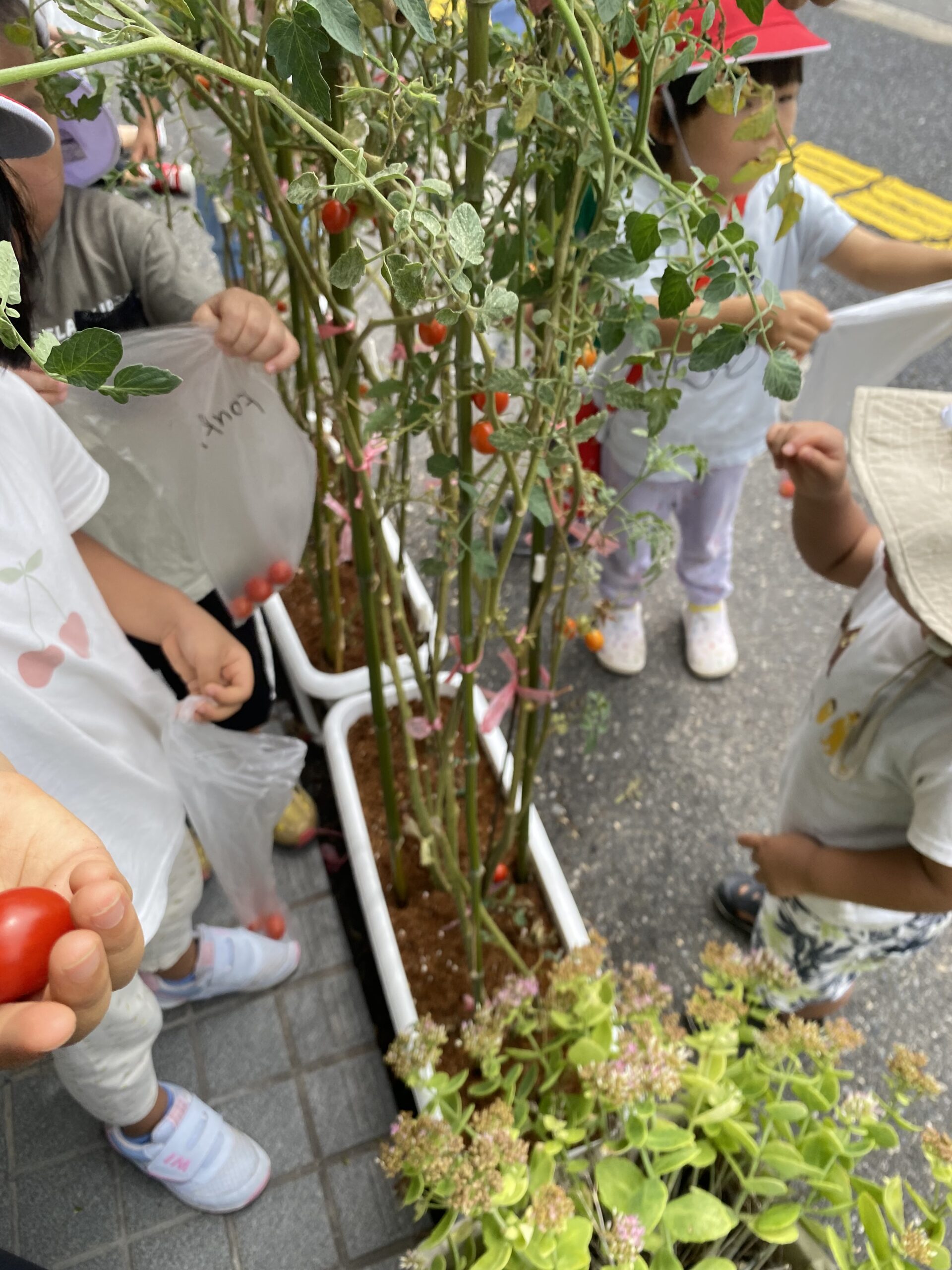 子たちはどんどん大きくなるトマトに毎日水やりをしてくれたり、青いトマトを見つけて「赤ちゃんがまた出来てる!」と喜んでいます