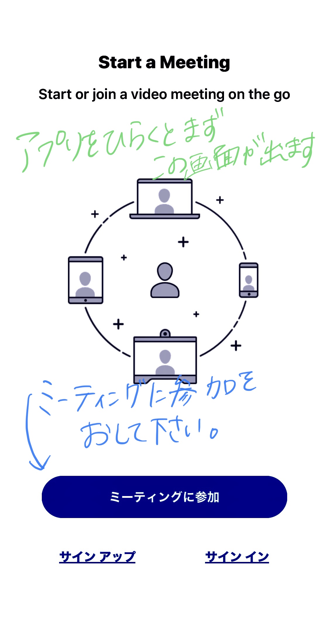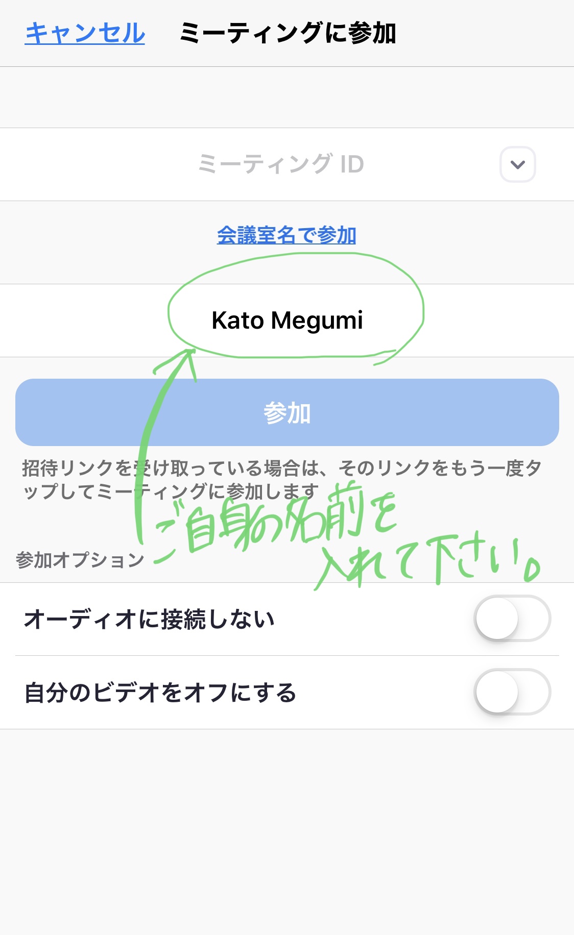 ④ミーティングID の下の枠には名前を入れてください(日本語でも英語でもどちらでもいいです。)