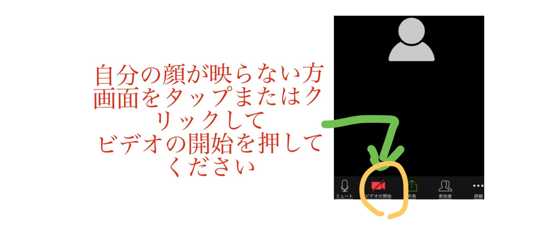 ・ホストの画像は見れるけど、自分の画面が暗いとき、→ご自身のビデオが停止されます。自分のタブレット、スマートフォン、