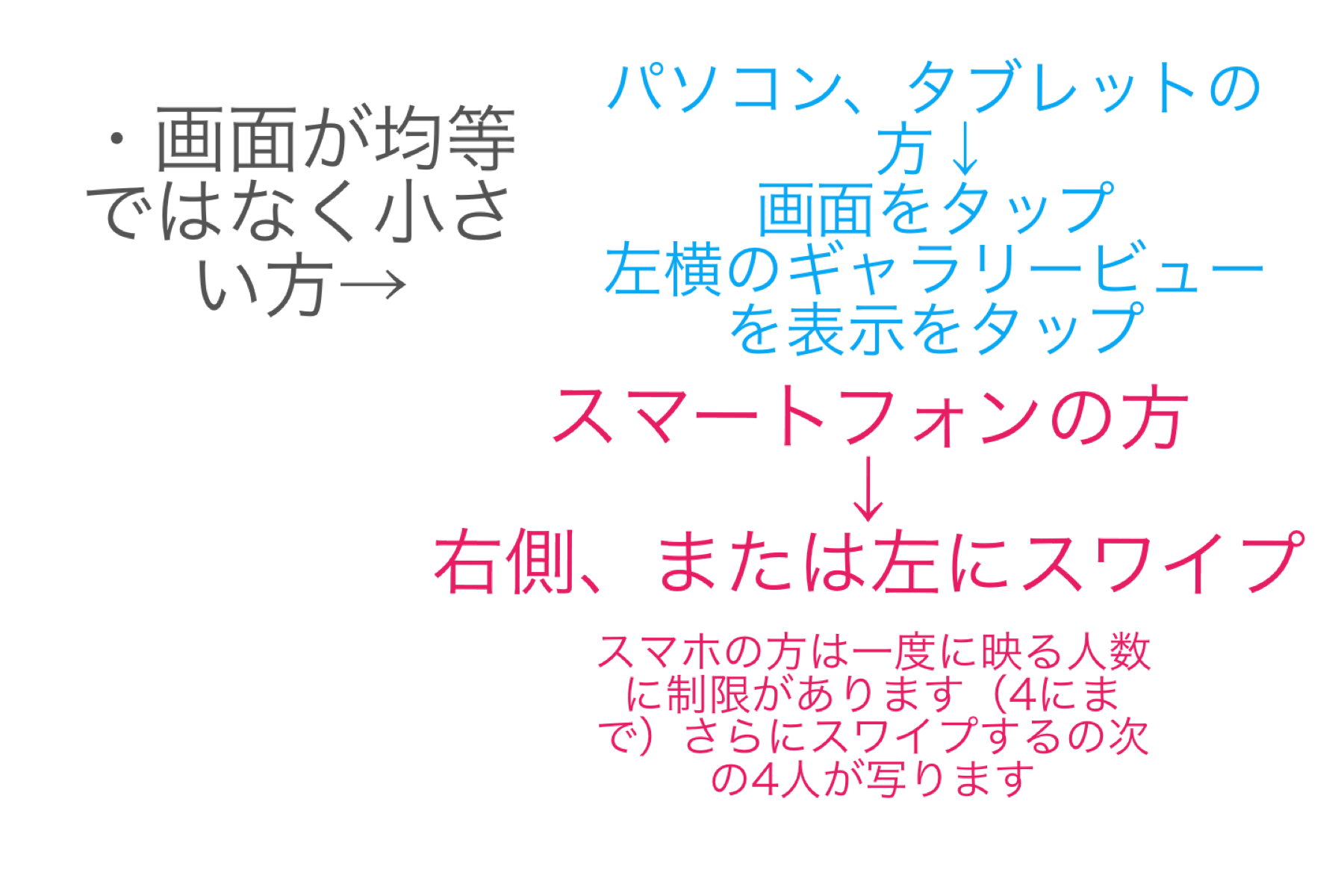 画面が均等ではなく小さいとき→パソコン、タブレットの方は画面タップ後左側のギャラリービューを表示